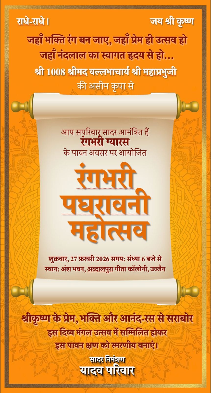 27 फरवरी को रंगभरी ग्यारस पर अंश भवन में बहेगी भक्ति की बयार, यादव परिवार द्वारा विशेष आयोजन