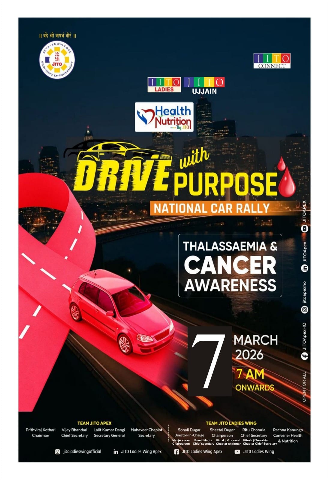 उज्जैन: कैंसर और थैलेसीमिया जैसी गंभीर बीमारियों के प्रति जन-जागरूकता लाने के उद्देश्य से आगामी 7 मार्च 2026 को शहर में ‘ड्राइव विद पर्पस’ नेशनल कार रैली का आयोजन किया जा रहा है। जीतो लेडीज विंग और जीतो उज्जैन द्वारा आयोजित यह रैली सुबह 7 बजे कॉसमॉस मॉल, नानाखेड़ा से शुरू होगी। जीतो उज्जैन लेडीज विंग की चेयरपर्सन मंजू सूर्या ने बताया कि यह एक राष्ट्रीय स्तर का आयोजन है। उन्होंने शहरवासियों से अपील की है कि वे अधिक से अधिक संख्या में इस कार रैली का हिस्सा बनें और समाज को जागरूक करने की इस पहल को एक मजबूत आवाज दें।