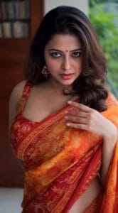 रंग संयोजन: यहाँ गहरे नीले रंग की साड़ी का चुनाव किया गया है, जिस पर सूक्ष्म चमक (Shimmer) है। इसके साथ लाल और नारंगी पैटर्न वाला कॉन्ट्रास्ट ब्लाउज एक ‘बोल्ड स्टेटमेंट’ देता है।