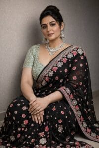 ब्लाउज डिजाइन: साड़ी के साथ एक स्लीवलेस फ्लोरल एम्ब्रॉयडरी वाला ब्लाउज पहना गया है, जो लुक को युवा और तरोताजा बनाता है।