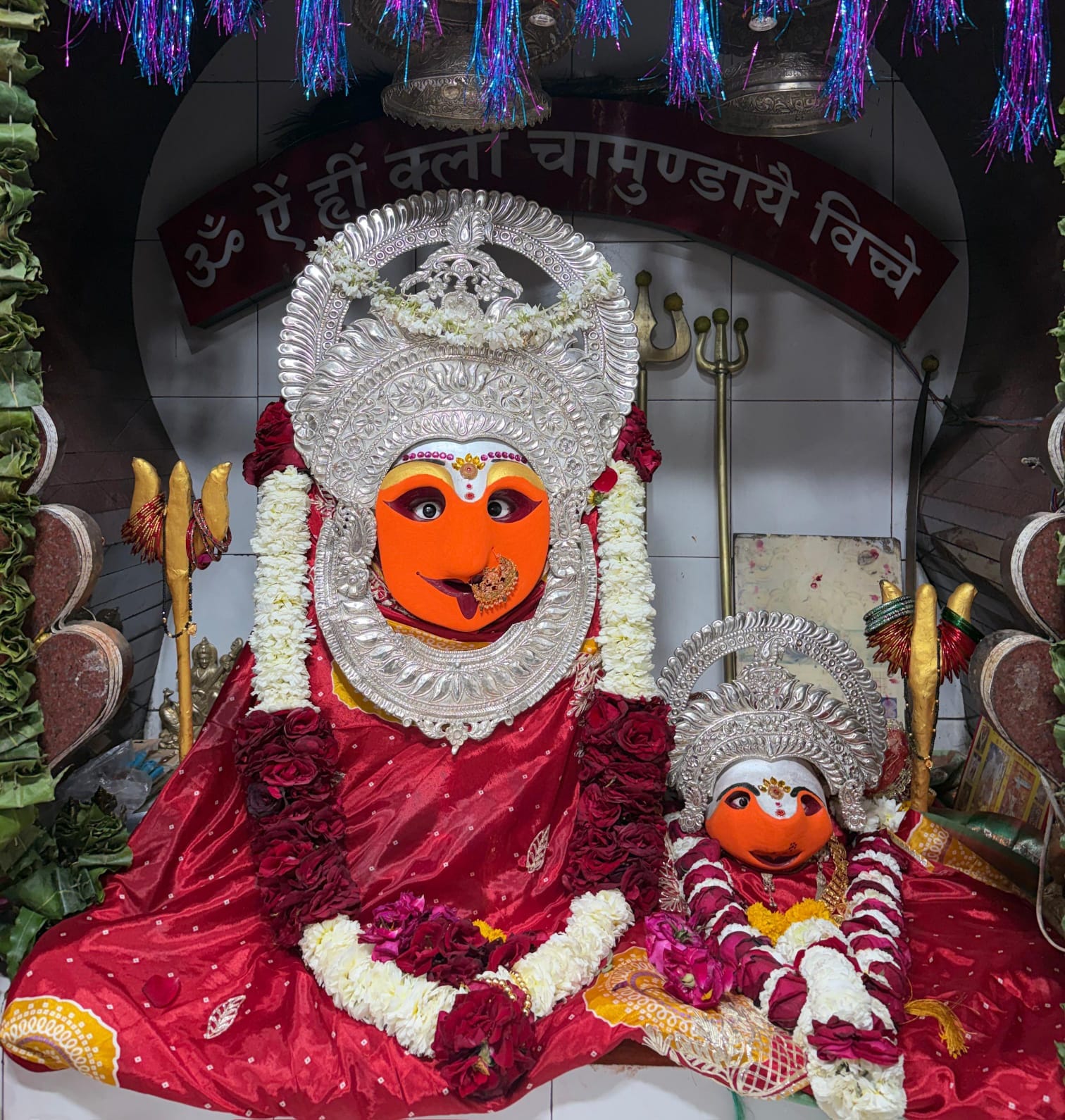 मंदिर में माता की मूर्ति पूर्व दिशा की ओर मुख करके विराजित है। मंदिर के परिक्रमा पथ पर नवदुर्गा की मूर्तियां भी स्थापित हैं, जिससे श्रद्धालुओं को चामुंडा माता के साथ नौ देवियों के दर्शन का लाभ प्राप्त होता है। इसके साथ ही परिसर में हनुमान जी, भैरव जी और शिवजी के दर्शन भी होते हैं। नवरात्रि के दौरान यहाँ प्रतिदिन बड़ी संख्या में श्रद्धालु दर्शन और पूजन के लिए पहुंचते हैं।
