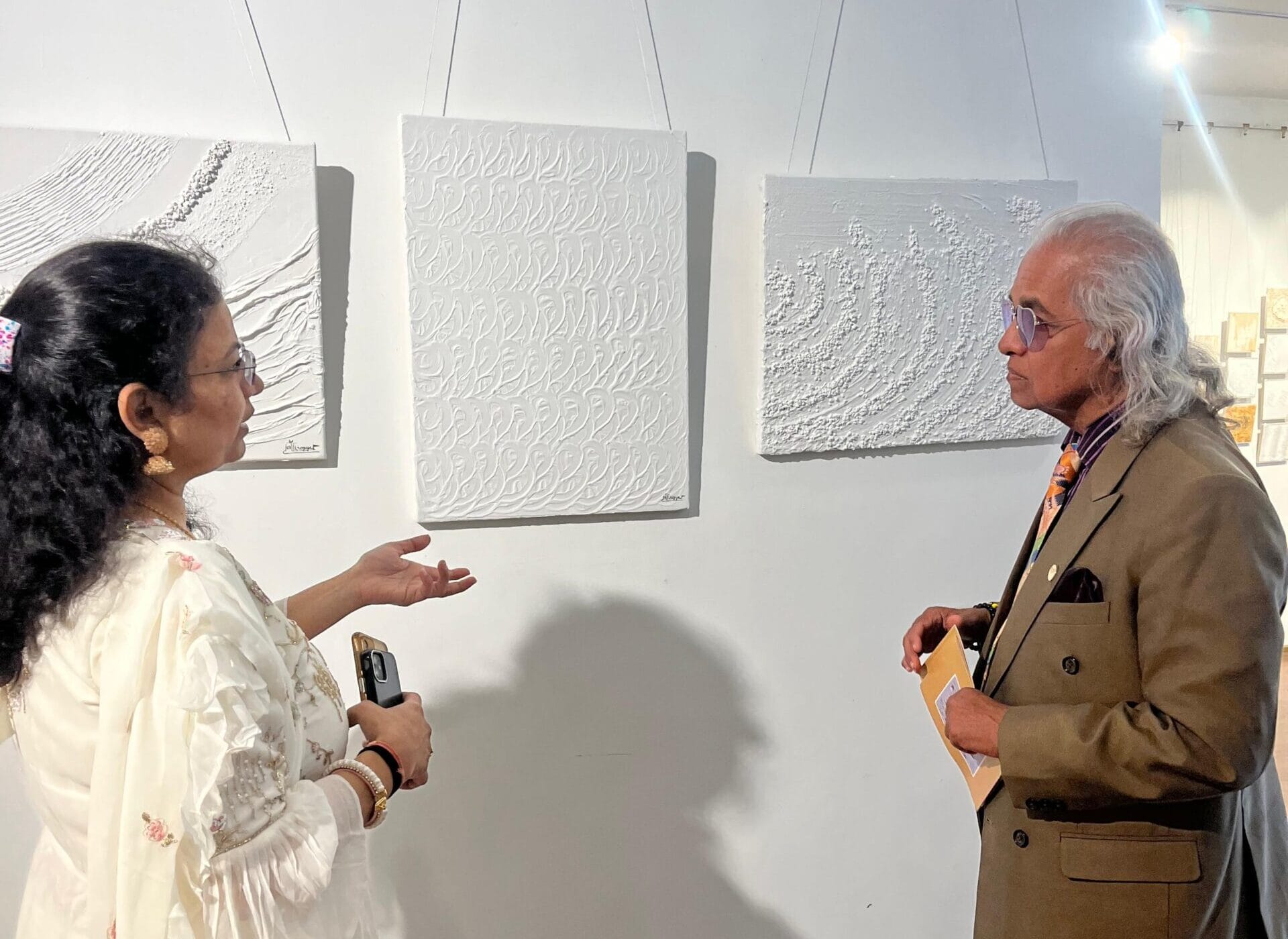 व्हाइट क्ले और कैनवास के बेहतरीन तकनीकी प्रयोग से सजे चित्रों को वरिष्ठ मूर्तिकार सुरेश कुमार ने सराहा